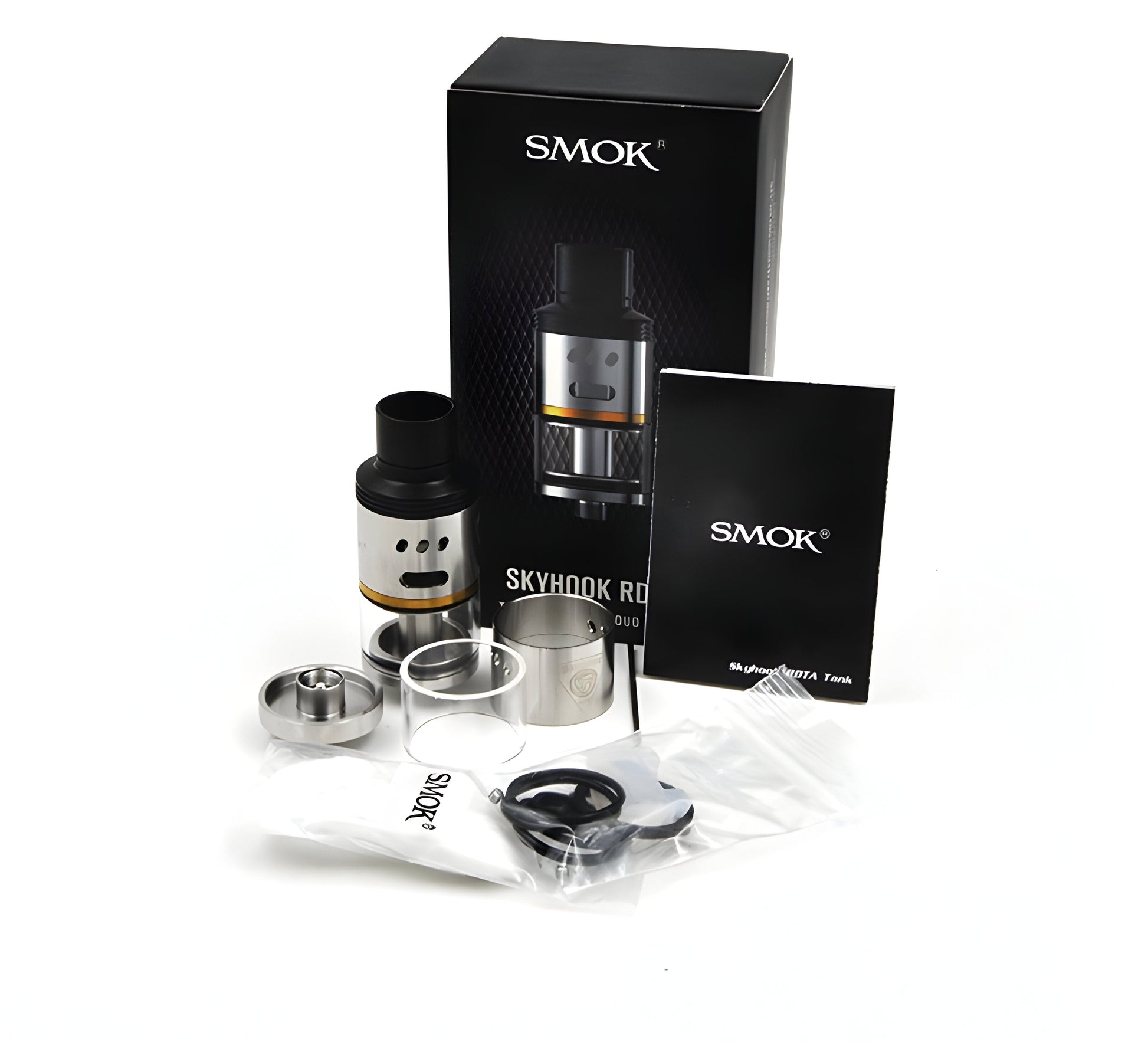 Skyhook RDTA is newest smok company beastly rebuildable atomizer, this new RDTA made of stainless steel and pyrex glass, nine different colors avaliable,can hold 5ml e juice,can fires up to 260watts,the deck is having the patented floating velocity style post so underneath makes the super large wicking slots for endless liquid feed capabilities,there are two atomizer tubes included for the most airflow channels choice, bottom & middle airflow, bottom airflow only or middle airflow only,the side refilling system more convenient and clean to adopt the innovative side refilling system,dont worry leaking. the smok skyhook rdta support single coil build when used with the silicone pad.if you want to find the mod that matches the newest smoktech RDTA, we will recommend alien mod, G320 mod, and g priv mod. this new tank will bring vapers a surprising experience that having extremely huge and dense clouds with pure flavor.